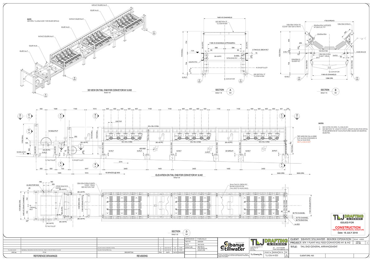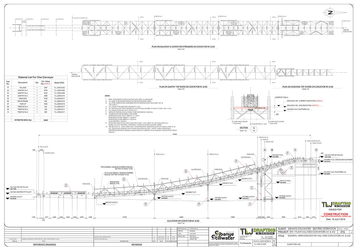 Project deliverables: Shop detail drawings for 2x mill feed conveyors. These included tail end, gantries, trestles, take-up, head end & drive. These conveyors were commissioned late 2018 / early 2019.